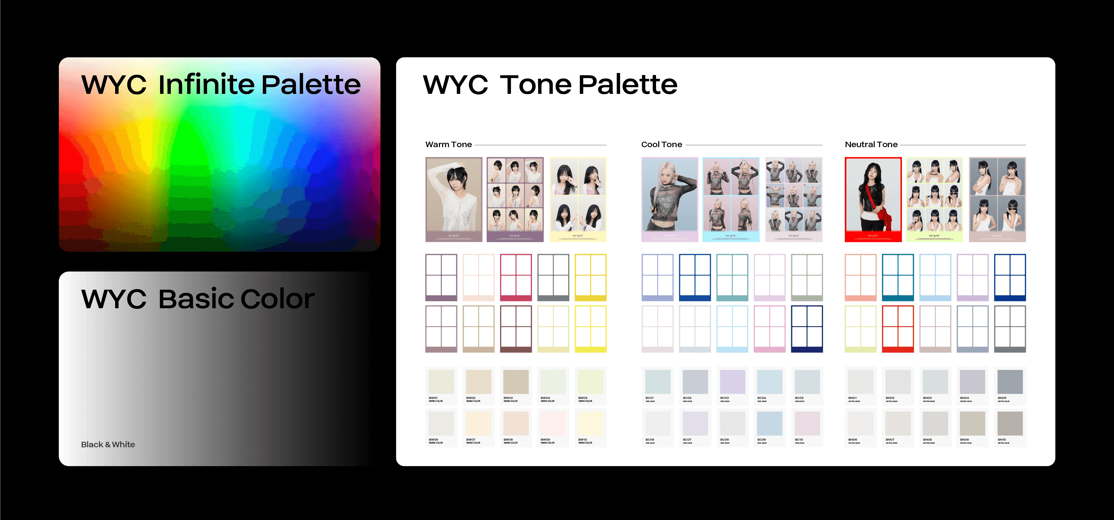 The graphic motif visualizes the process of color development, where small dots converge to form a spectrum. This represents the infinite possibilities of color harmony. This visual narrative symbolizes the user journey at WYC: selecting and combining colors to create a personalized visual narrative. The motif expands dynamically across mediums, creating a cohesive brand language from microscopic dots to macroscopic spaces.